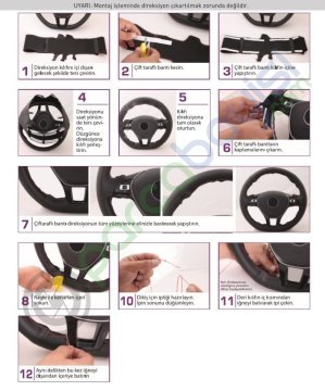. Uygulama sırasında paketin içerisindeki aparatlar ile kılıfı rahatlıkla uygulayabilirsiniz. Çift taraflı bant ile direksiyona sabitlenen kılıf daha sonra yağlı ip ve özel iğnesiyle direksiyona uygulanır.
